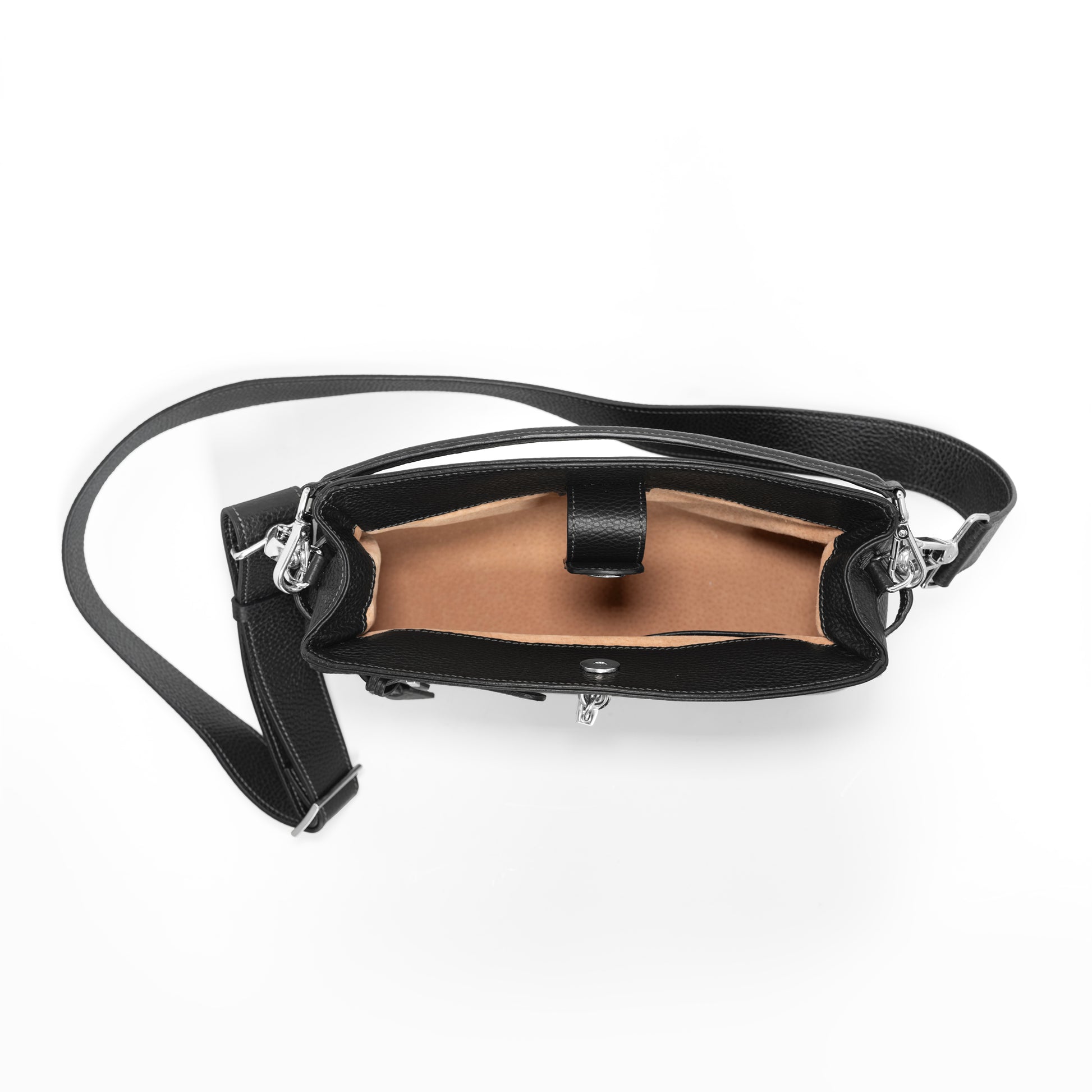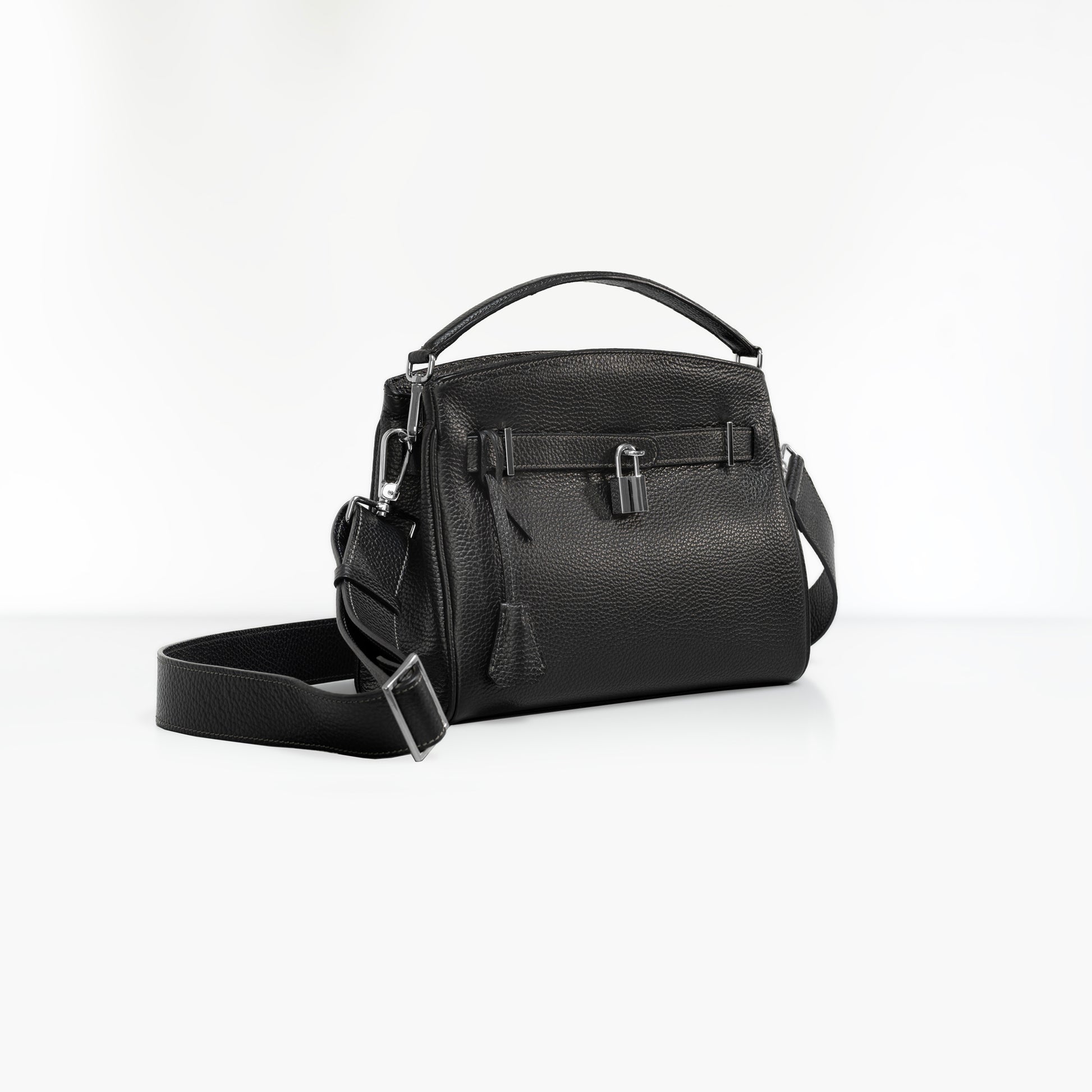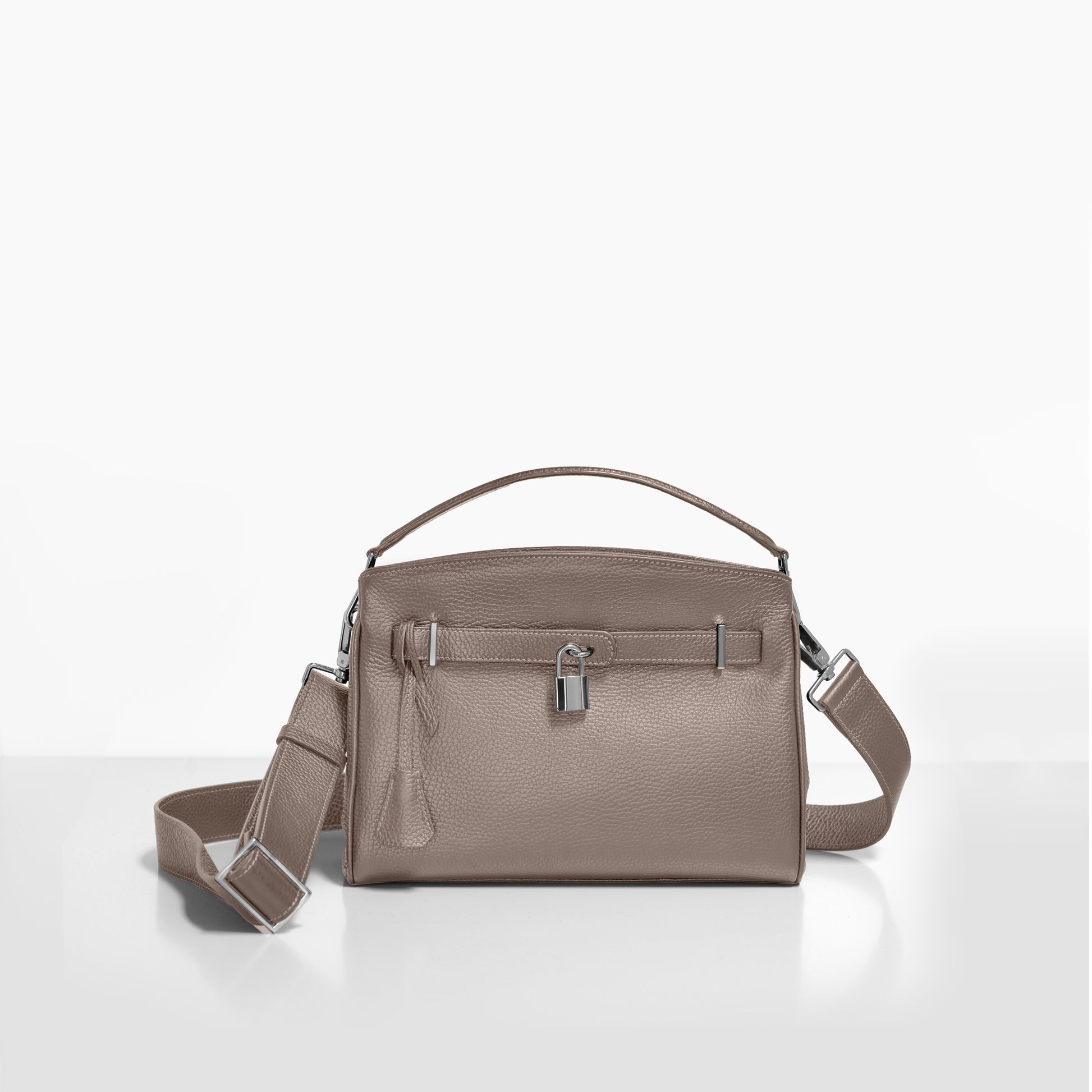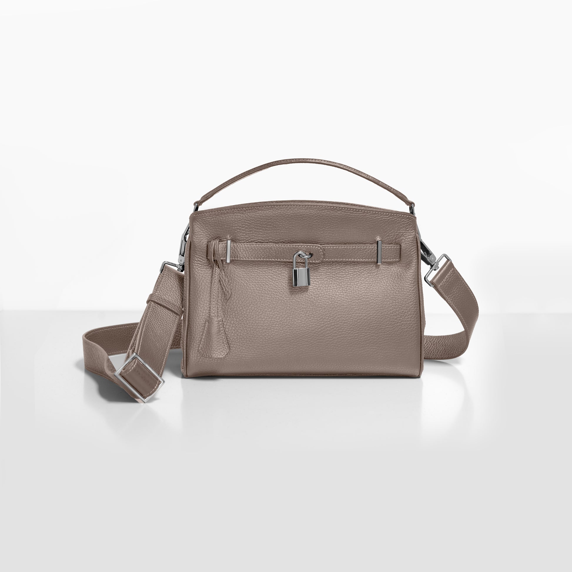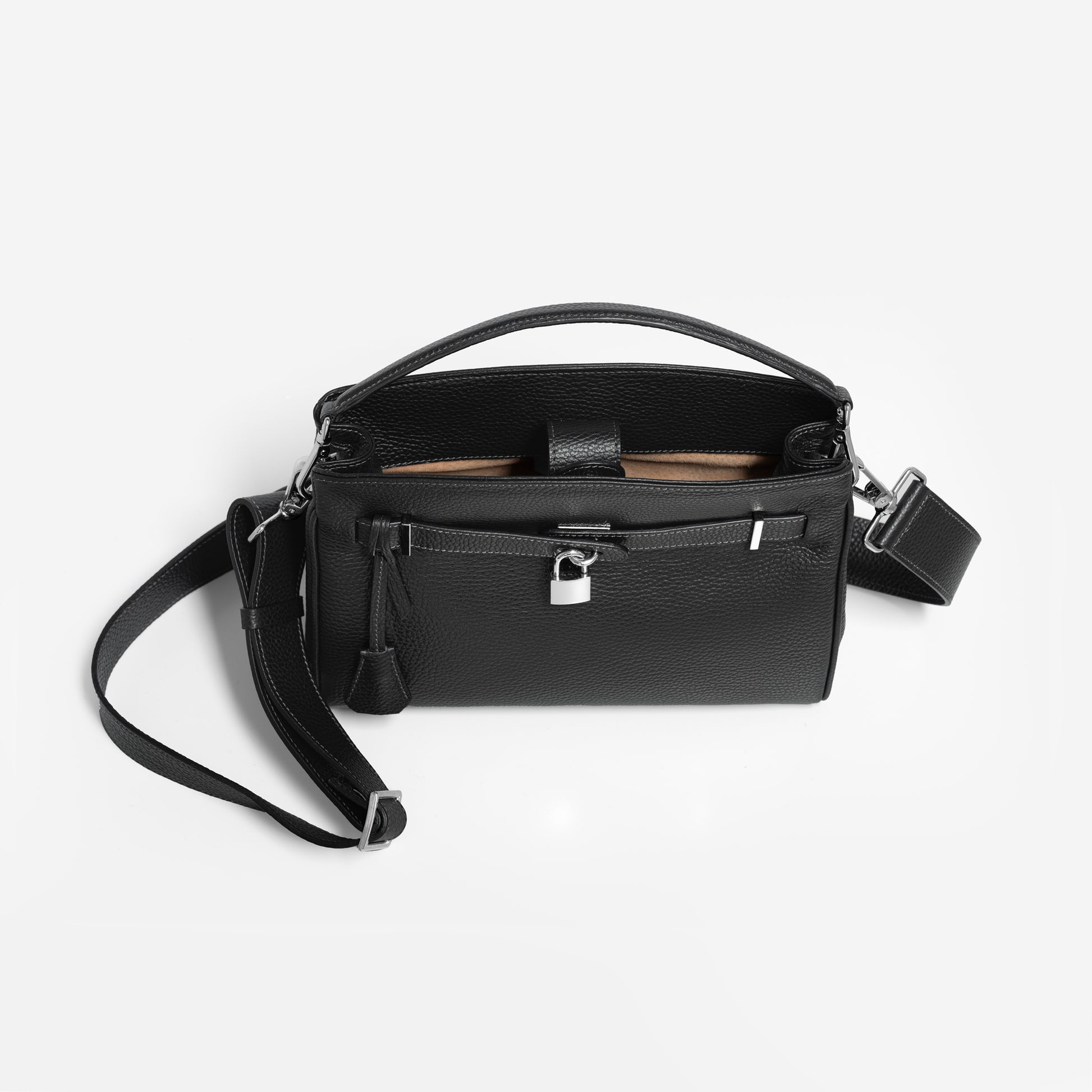 1つのコンパートメント、フラップ、2つの小物ポケット、カデナで拡張可能、クロシェット、取り外し式のハンドル、取り外し式のショルダーベルト